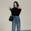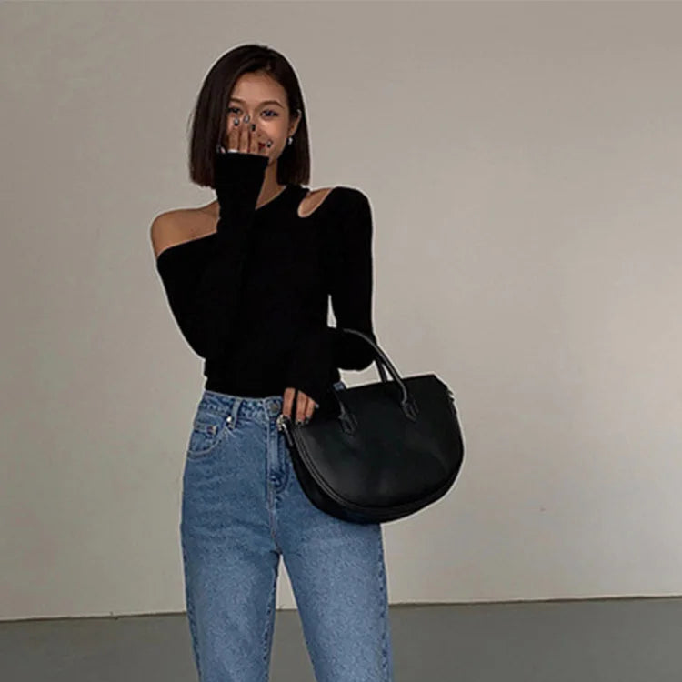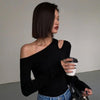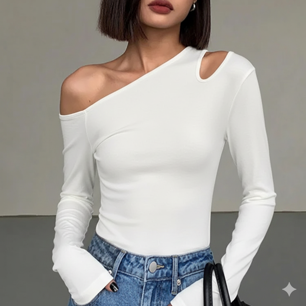 טופ קרופ צמוד לנשים עם צווארון אלכסוני ושרוולים ארוכים נופלים, שמחמיא ומדגיש את הקימורים בעדינות. בד גמיש ונעים ללבישה, עם חיתוכים עדינים שמוסיפים טאץ’ סקסי וסטייל אורבני מושלם ליום או לערב.
